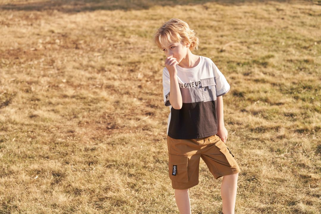 一条黑棕色的短裤与短袖形成由浅到深的穿搭层次感,简约的版型收敛孩子的张扬,让童趣恰到好处。