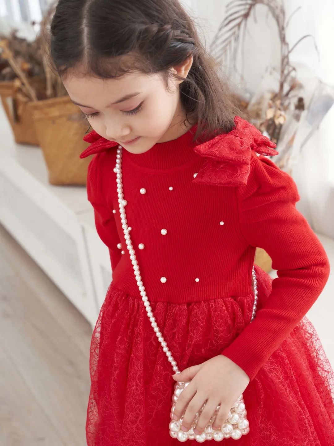 再加上斜跨的珍珠小包,不仅可以与毛衣上的珍珠相互映衬,还可以让小朋友收藏一些属于自己的小宝贝,大人们看着喜庆,孩子也开心!