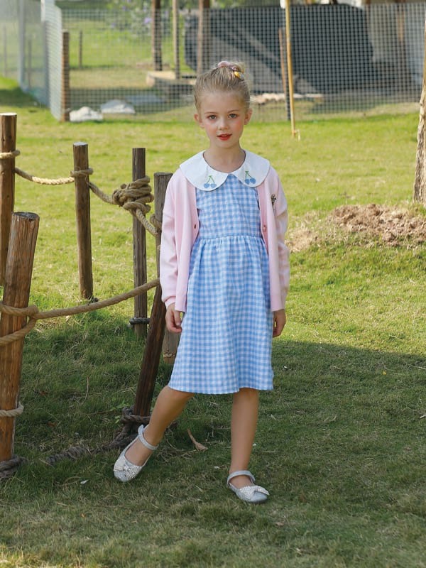 春天就应该穿一些看上去清爽舒适的颜色,这件天蓝色的格子连衣裙,视觉上让人更加舒适,干净清爽在春天最合适不过了,娃娃领设计更加可爱俏皮,如果担心孩子着凉可以在外面披一件针织衫,不仅保暖也十分的好看。