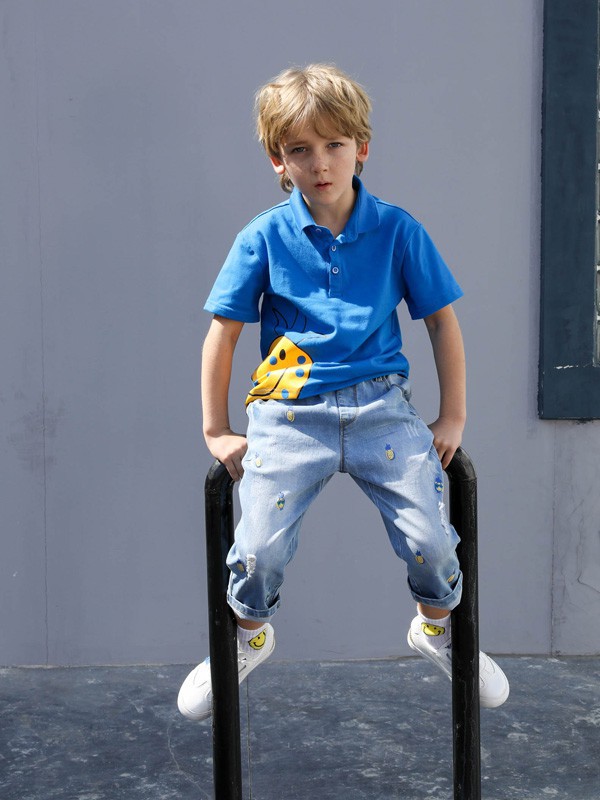 相较于女孩子花式多样的小裙子,男孩子的穿搭就显得稍微有点单调,T恤搭配牛仔裤就十分常见了,这款深蓝色Polo衫搭配浅色系牛仔裤更加绅士精致,看起来帅气十足呢!