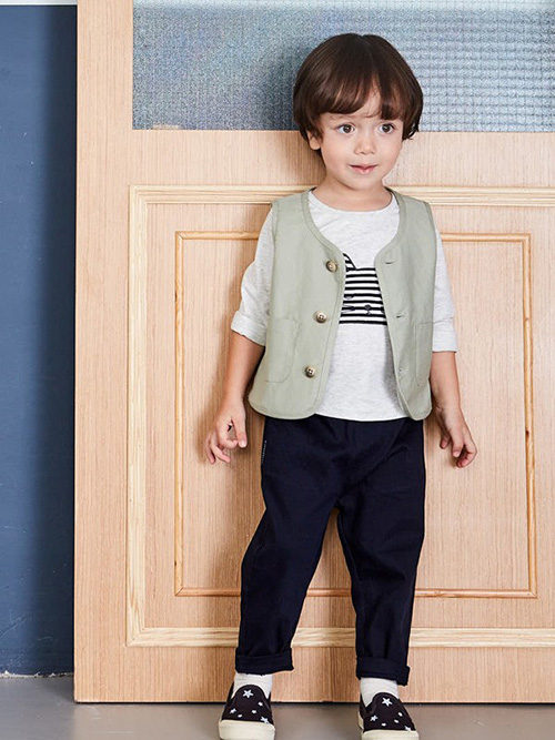 长袖T恤与夹克的搭配也是初秋常见的萌娃穿搭,优果贝贝童装的灰白色T恤搭配深灰色外搭,温暖又时尚,黑色下装的选择衬托出了宝贝的大长腿,整体造型超给力!