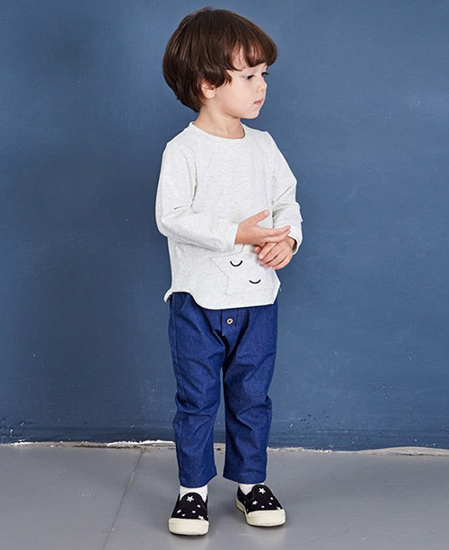 初秋时节正适合穿简单又可爱的长袖T恤,既能防风又不会太闷热,便于宝贝感受秋日的凉爽。不规则版型与卡通图案为简单的长T带来许多萌感,搭配蓝色长裤,简约又帅气。
