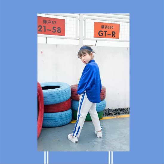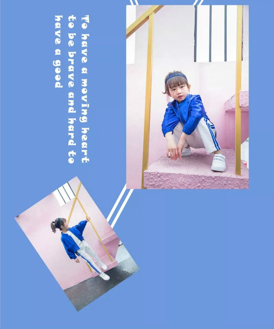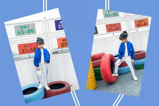 纯蓝色的运动外套搭配上一件纯白的短袖剪纸的剪裁,显得小巧玲珑白色的运动裤加上蓝色的条纹,显现初一双修长的双腿。穿上后给人一种青春活力十足。
