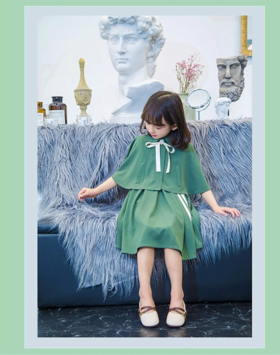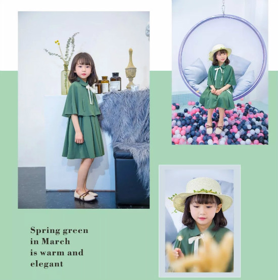 墨绿色的连衣裙,衣领处的蝴蝶结的少女心设计。让人一看就喜欢上他,下身的褶皱设计俏皮又活泼穿上仿佛在森林中一只翩翩起舞的蝴蝶。