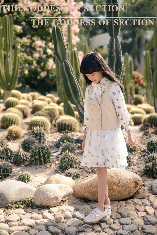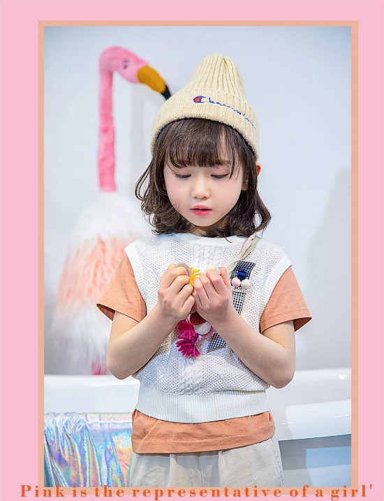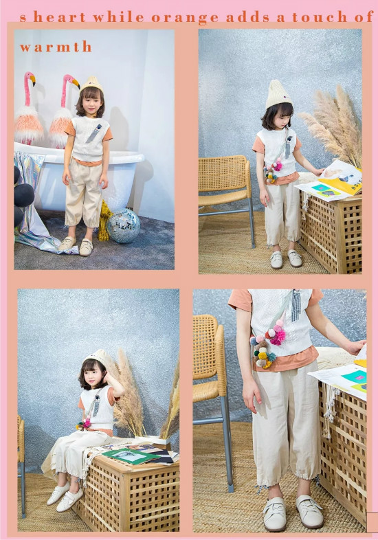 一件暖色的T恤加上一件雪白的针织马甲,配上一个可爱的胸针把他衬托的文静优雅可爱迷人。再配上一条优仔优妹童装的卡其色裤子简约而不失美丽。