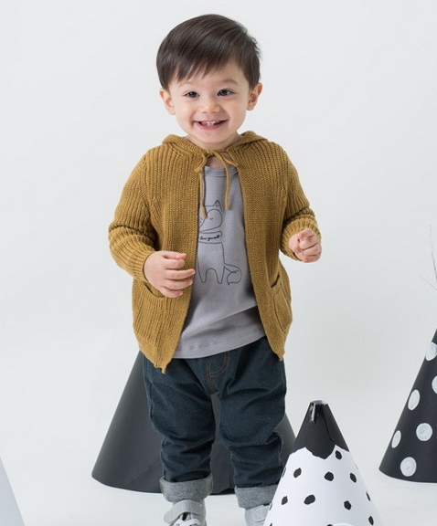 连帽的帽子会觉得效果非常好,连帽也显得比较的青春活力。如果是大人穿搭肯定很减龄,不过小朋友本身就很嫩,不需要减龄但是需要青春活力。优果贝贝童装连帽毛衣开衫搭配,姜黄色的颜色男女都适合,内搭一件灰色T恤衫,下身搭配牛仔裤即可。