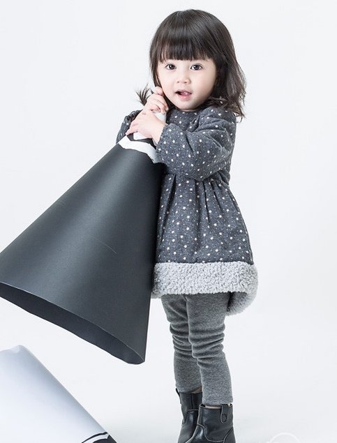 女孩儿就适合穿裙装,上穿一件波点裙灵动又充满童趣,下穿一条棉质打底裤可爱又简单,三种灰相搭竟然一点也不违和呢,反而显得更加自然,收腰处还带有不规则的褶皱,做工细腻。如果宝宝特别怕冷,多加一件保暖衣就可以啦,再踩上一双小靴子,别提有多好看呢。