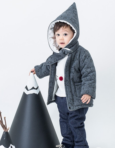 男孩儿穿起外套和长裤,同样的整体百搭灰色系,显得简约,纯棉的外套带有满满的小星星,尖帽子的设计走在了潮流前线,小朋友们应该会非常喜欢的,内搭的话,打底衫、针织衫或者卫衣都是可以的,长裤选择与上装和谐的颜色,再配上一双小小的绑带亮黑皮鞋,帅气满分。