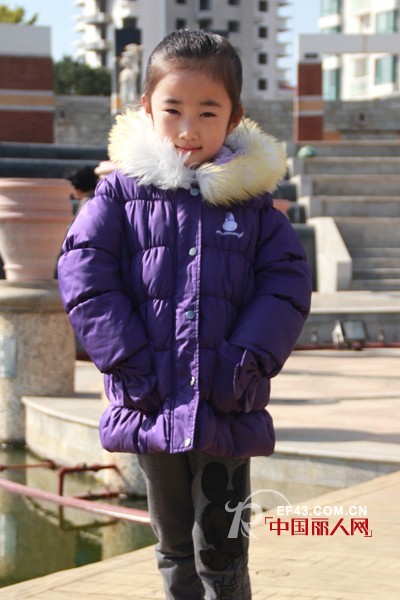 紫色镶毛羽绒服温暖舒适,搭配紧腿休闲裤,上宽下窄的装扮让你变身小潮人。