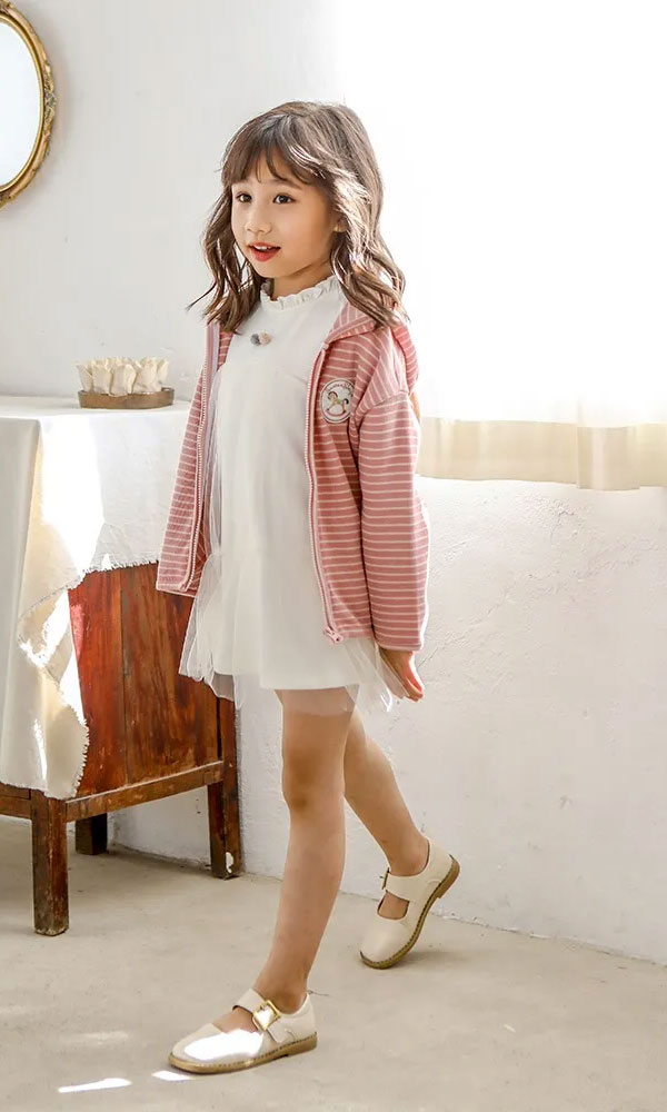 外套粉色条纹夹克上衣 & 白色连衣裙