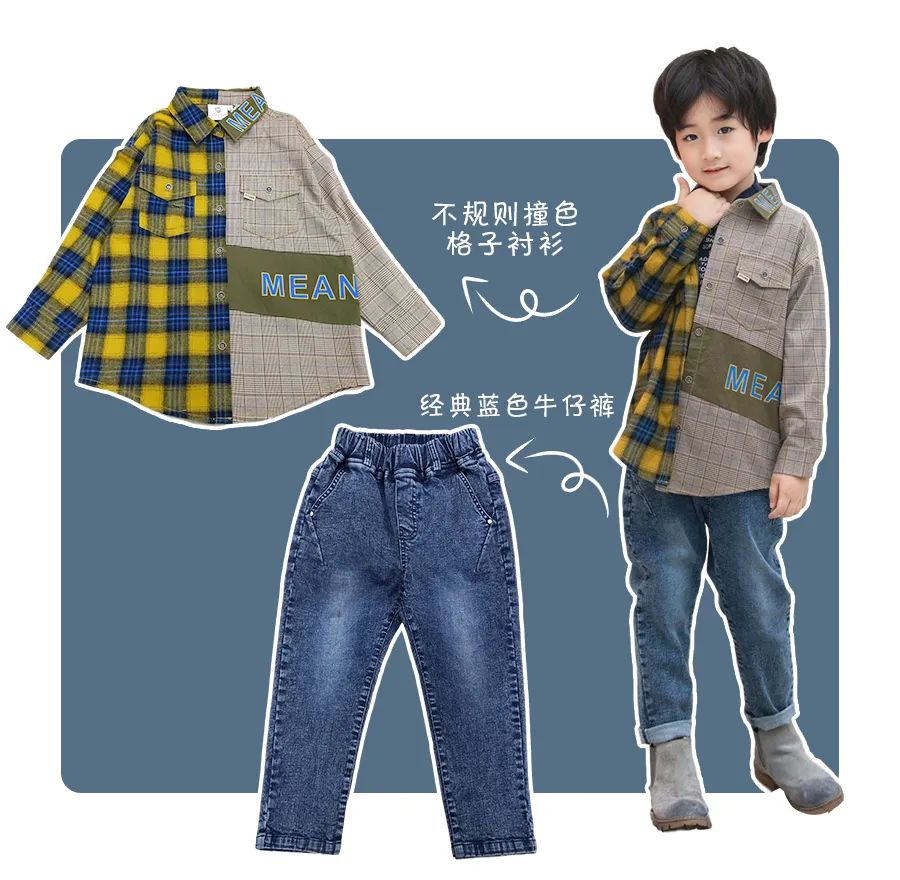 搭配二:不规则撞色格子衬衫+经典蓝色牛仔长裤
