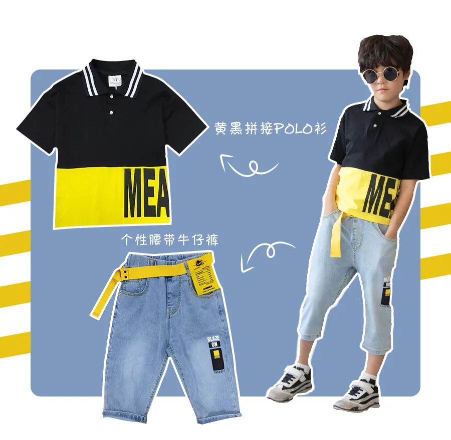 塔配-:黄黑拼接撞色Polo衫+个性腰带牛仔裤
