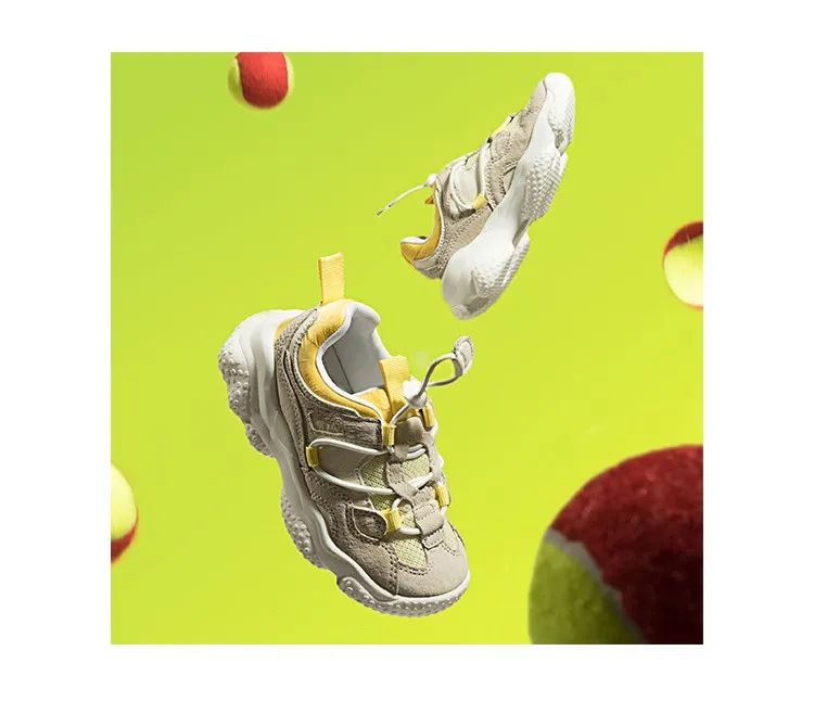 时尚拼接网面-网面+穿松紧带的织带+鞋口和鞋舌头的三种不同程度的黄色拼接,增加搭配时尚度,让黄色更有层次感,后跟包裹设计 保护脚踝,后跟材质稳固 轻松包裹脚踝,防止在运动中扭转受伤,穿脱便捷松紧鞋扣+真皮拉头,方便宝贝自行穿脱,真皮拉头相对直接松紧拉手更有支撑点更舒适,二层猪皮+高弹坡度乳胶鞋垫-真皮材质吸汗透气,乳胶部分高弹舒适,符合宝贝生长发育的人体工学