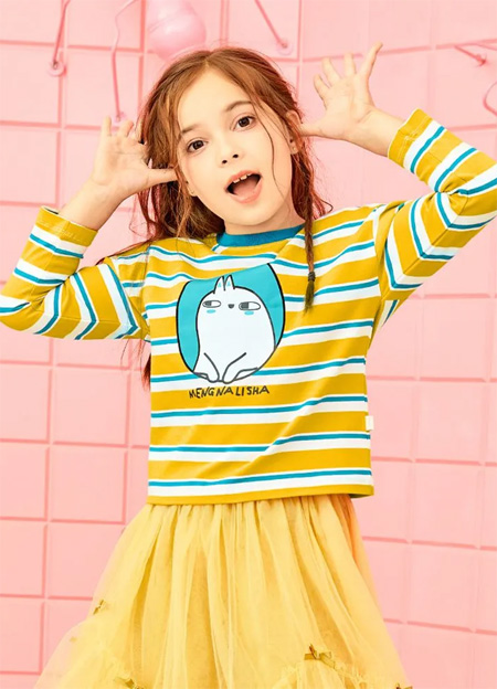 追求自我长大的新时代孩子, 衣服不再只是需求,而是一种态度的表达,每个孩子都是与众不同的个体,也需要独属于自己的鲜明态度。黄蓝白条纹+可爱玩偶图案结合,碰撞出蓬勃的活力,清爽雅致又干净纯粹,个性十足。
