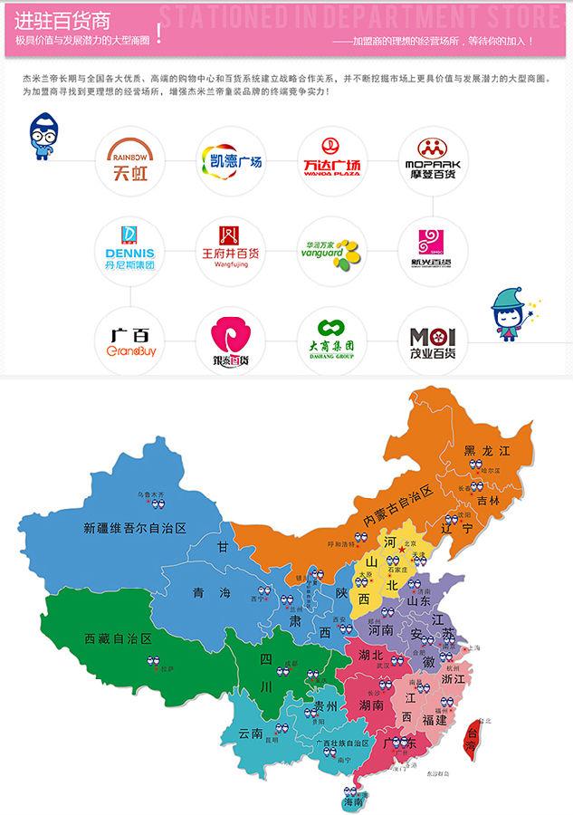 3)品牌价值:杰米兰帝童装品牌发展至今,对国内童装零售市场起到了一定的推动影响力,一直以来我们的零售终端店遍布全国各地,我们正加快速度打造中国名牌童装品牌乃至世界名牌童装。